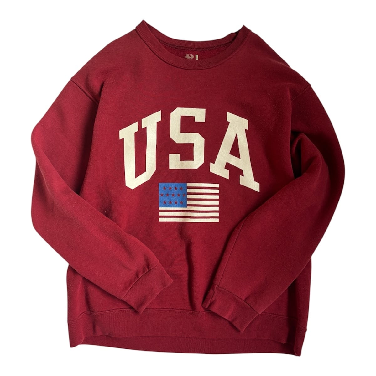 ボルドーカラーのボディにホワイトプリントが映え、古着らしい雰囲気たっぷり。