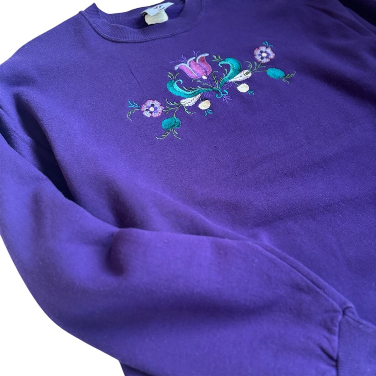 深みのあるパープルカラーと、カラフルな刺繍の組み合わせが古着らしい雰囲気を演出します。