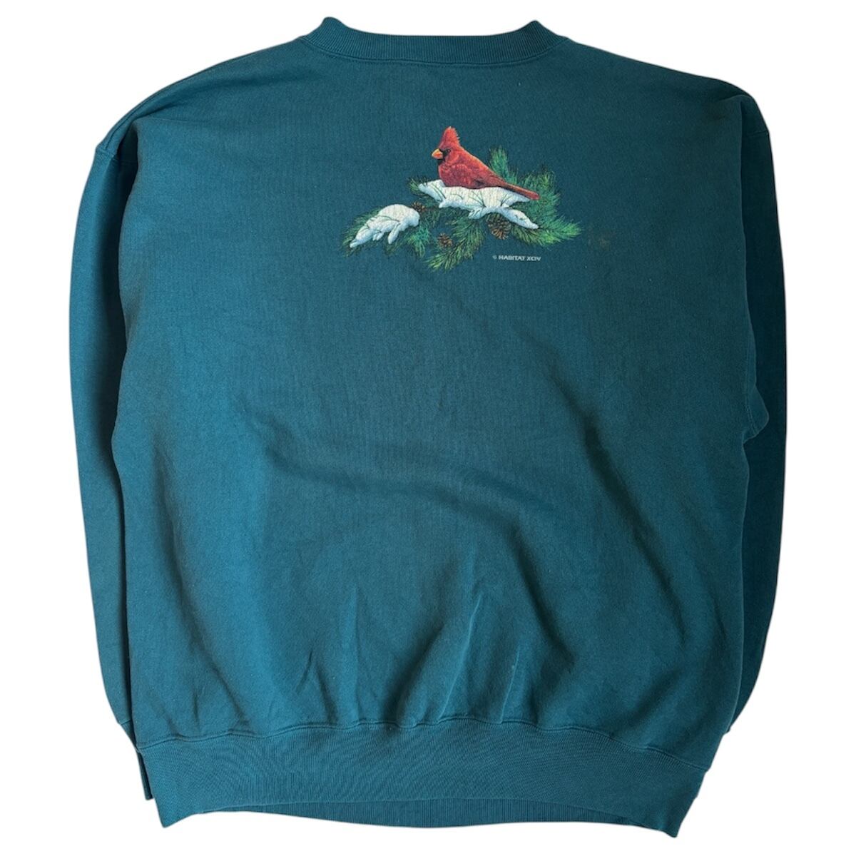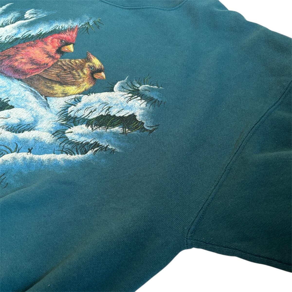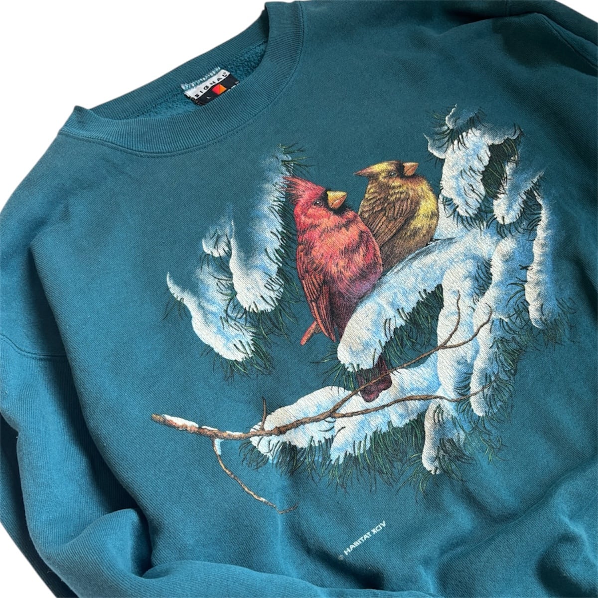 深みのあるダークグリーンのボディに写実的な鳥のプリントが映える、